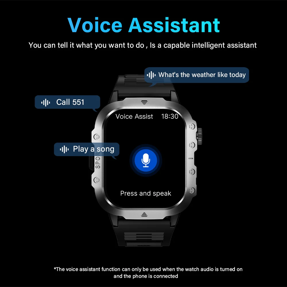 5. Voice assistant function :This smartwatch is equipped with a voice assistant function that allows you to make Bluetooth phone calls and access voice services, which is convenient and easy to use.