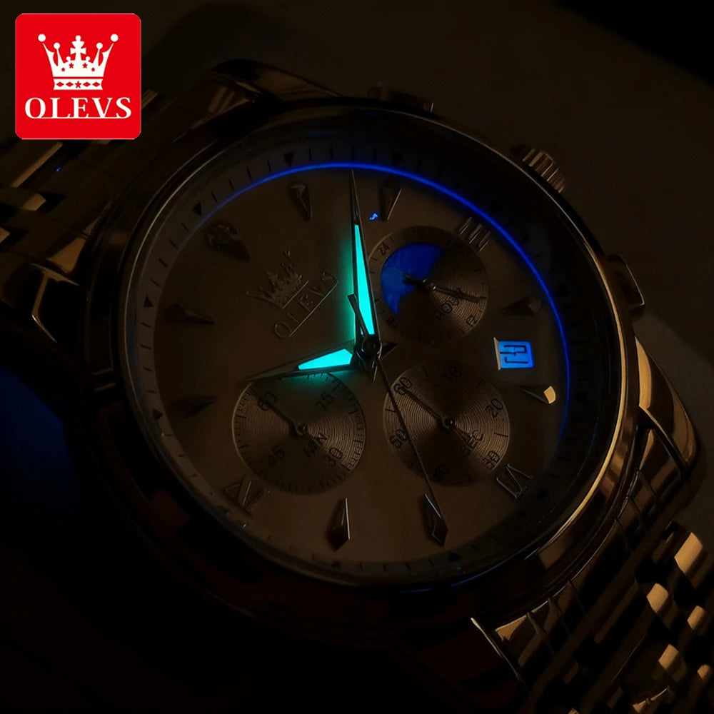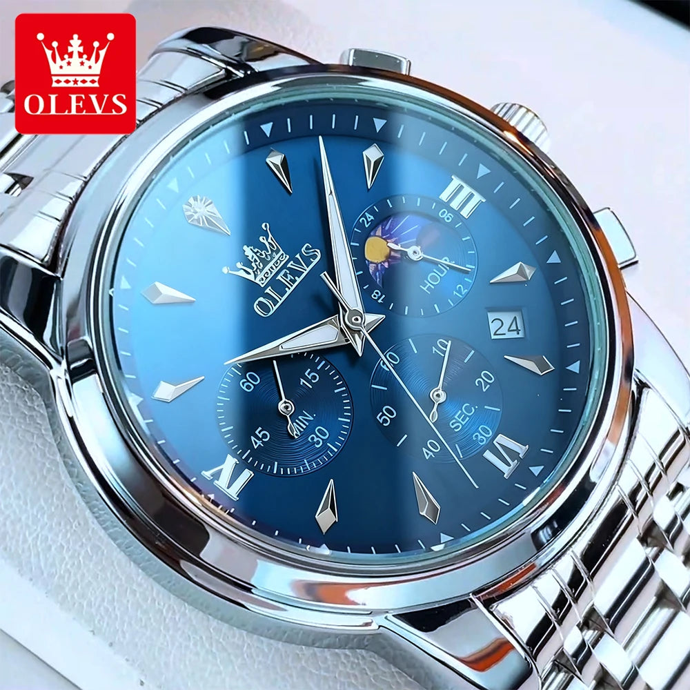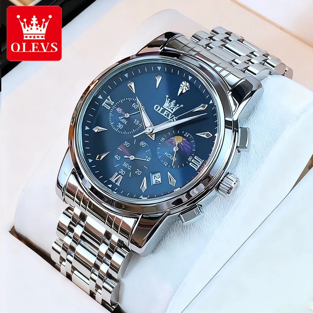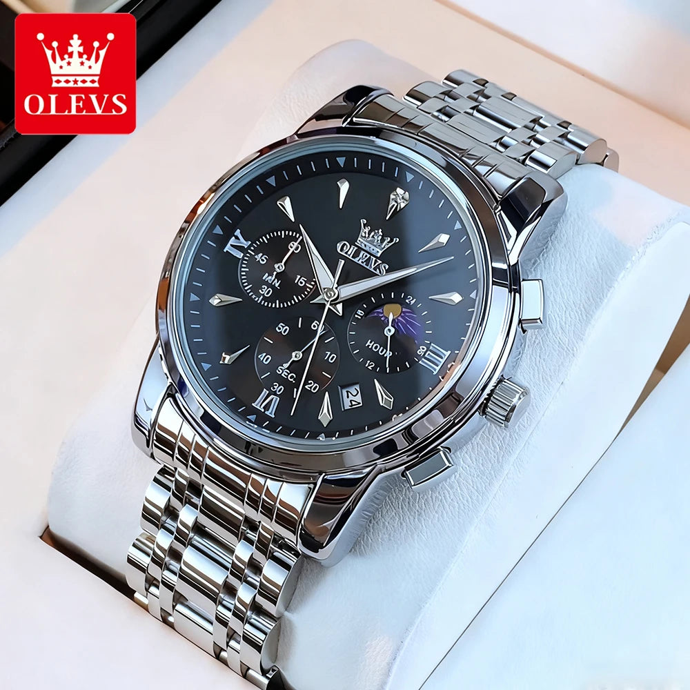 OLEVS Men's Moon Phase Watch - Luxury Steel Quartz Wristwatch
