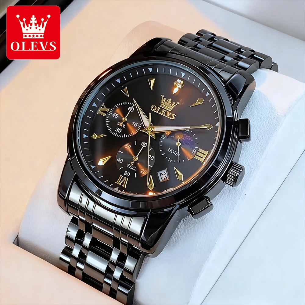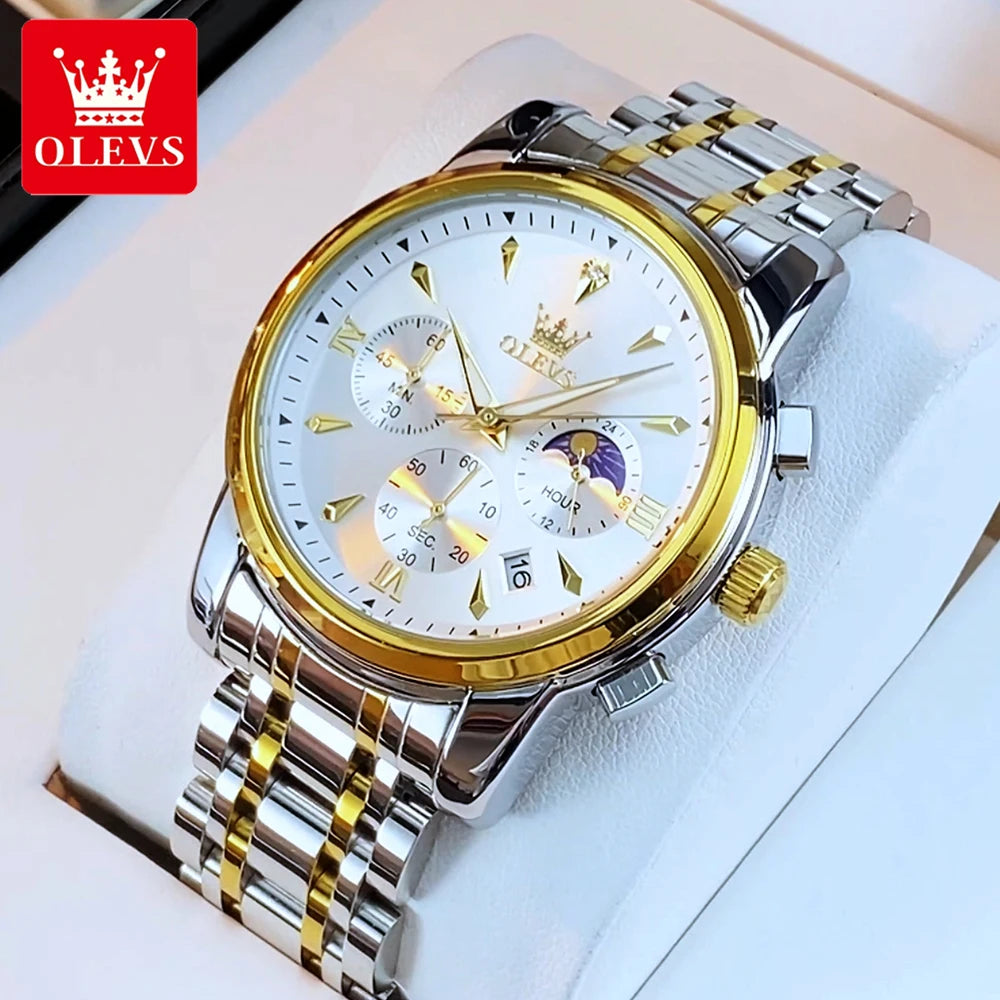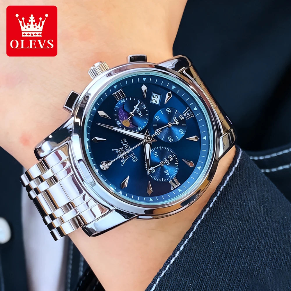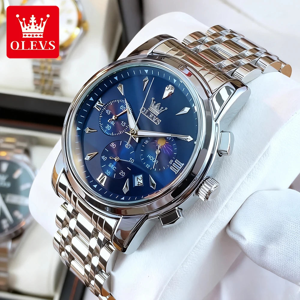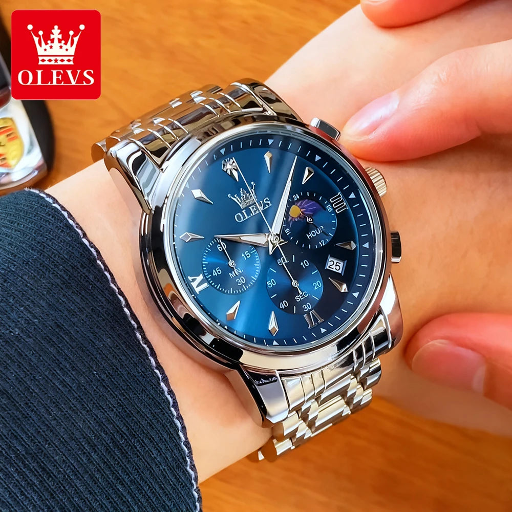 OLEVS Men's Moon Phase Watch - Luxury Steel Quartz Wristwatch