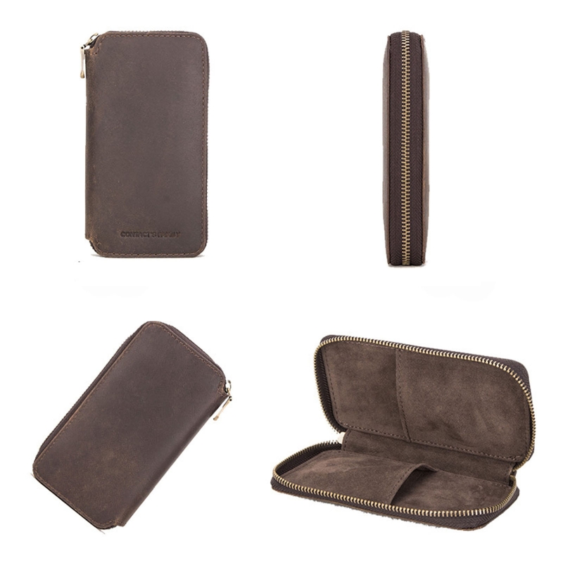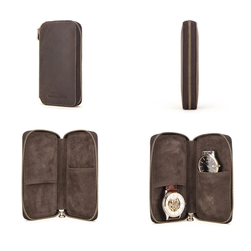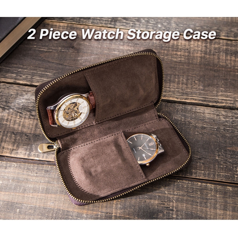 Rustic Leather 2-Slot Watch Box Luxury with Zipper Portable Bag Holds Watches Brown Watch Bag